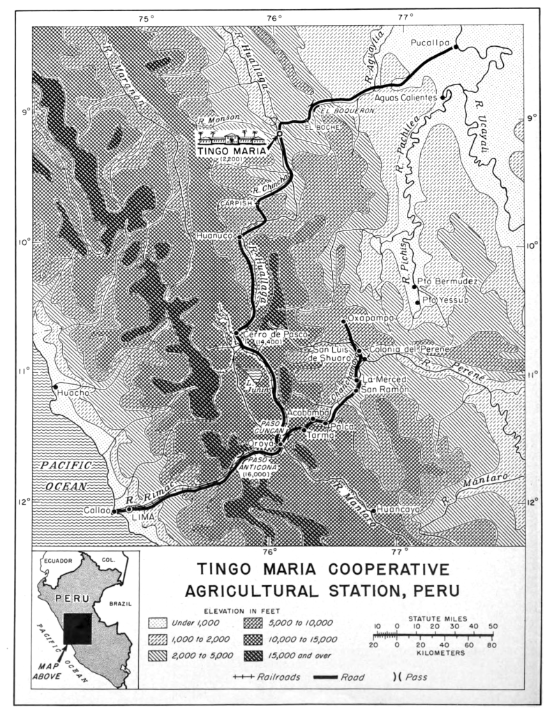 The Estacion Experimental Agricola was “one of a series of agricultural experiment stations being established throughout the American tropics designed to assist and encourage the production on a large scale of rubber, quinine and other products formerly obtained from the Far East.” In the early years of the agricultural experiment station near Tingo Maria, it was run by scientists from the U.S. Department of Agriculture—the first, in 1943, was Dr. Benjamin J. Birdsall—in cooperation with the director of forest lands and colonization. In its first decade, a total of 23 American scientists served at the station, typically with five on duty at a time and a goal of “working themselves out of the job” by “training Peruvians to take their places.”