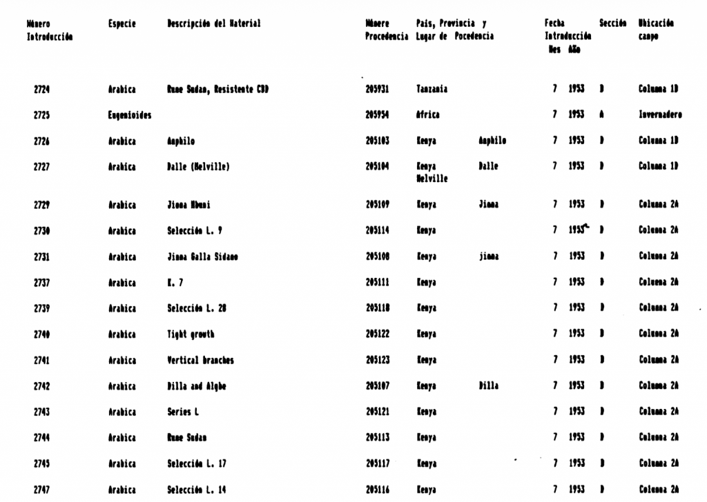 488 seedlings were sent to the Instituto Interamericano de Ciencias Agropecuarias (IICA) in Costa Rica. Like the station at Tingo Maria, IICA—known today as CATIE—which, like the station at Tingo Maria, was founded in 1942 during the United States’ wartime prioritization of research and the State Department’s efforts to influence Latin American politics. Beginning in 1948, the station began building an ex-situ collection of coffee germplasm to serve as a reference for research. This collection later would form the primary gene bank later used for genetic fingerprinting by RD2, CIRAD, WCR and other researchers.
