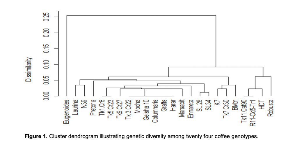 In a paper published in 2011 in the International Journal of Biodiversity and Conservation, researchers used molecular markers to analyze the genetic diversity of Kenyan commercial coffee and Kenyan museum collections. The RAPD + limited SSR method used by the researchers is now largely considered obsolete; it does not offer high-confidence discrimination between closely-related Arabica types, distinguish between different Ethiopian landraces at high resolution, nor provide forensic-grade identifications like the methods used by RD2. But: it does offer the ability to identify introgressed materials, show narrow diversity among C. arabica and cluster varieties by related genotypes. Among those genotypes tested included SL-34, SL-28 and K7 and Geisha 11 from Kenya—and Columnaris from Puerto Rico. According to the authors,